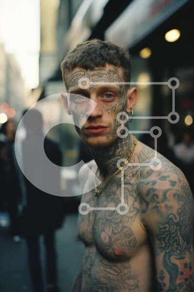 Υπάρχει δυνατότητα προσωποποίησης με δική σας φωτογραφία και προσαρμογής διαστάσεων κατόπιν παραγγελίας. Το συγεκεριμενο puzzle παρουσιαζει Η εικόνα απεικονίζει έναν άνδρα με τατουάζ στο στήθος, την πλάτη και τους ώμους του. Στέκεται στη μέση του δρόμου, κοιτώντας μακριά από την κάμερα. Υπάρχουν πολλά κοσμήματα ορατά στο σώμα του άνδρα, υποδηλώνοντας ότι μπορεί να κουβαλάει κάποιο πολύτιμο αντικείμενο. Ένα μοναδι
