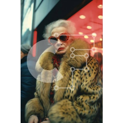 Υπάρχει δυνατότητα προσωποποίησης με δική σας φωτογραφία και προσαρμογής διαστάσεων κατόπιν παραγγελίας. Το συγεκεριμενο puzzle παρουσιαζει Η εικόνα απεικονίζει μια ηλικιωμένη γυναίκα που φορά ένα γούνινο παλτό με λεοπάρ και γυαλιά ηλίου. Στέκεται στο δρόμο, πιθανώς κοντά σε άλλους πεζούς ή περαστικούς. Υπάρχουν πολλά κόκκινα φώτα γύρω από τη γυναίκα, τα οποία μπορεί να υποδεικνύουν ότι είναι έξω κατά τη διάρκεια
