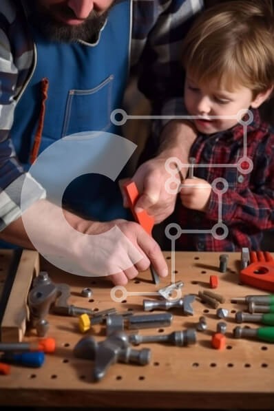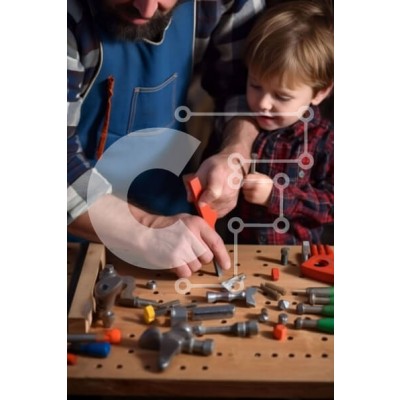 Υπάρχει δυνατότητα προσωποποίησης με δική σας φωτογραφία και προσαρμογής διαστάσεων κατόπιν παραγγελίας. Το συγεκεριμενο puzzle παρουσιαζει Η εικόνα απεικονίζει έναν πατέρα και τον γιο του να εργάζονται μαζί στον πάγκο εργασίας. Ο άνδρας φοράει φόρμα, ενώ το αγόρι κάθεται στο πάτωμα δίπλα του. Ασχολούνται με διάφορες δραστηριότητες, όπως σφυρηλάτηση καρφιών σε ξύλο, χρήση εργαλείων και παιχνίδι με παιχνίδια. Ένα