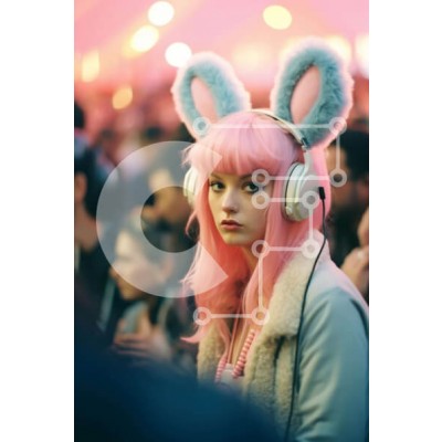 Υπάρχει δυνατότητα προσωποποίησης με δική σας φωτογραφία και προσαρμογής διαστάσεων κατόπιν παραγγελίας. Το συγεκεριμενο puzzle παρουσιαζει Η εικόνα δείχνει μια γυναίκα που φοράει ροζ αυτιά κουνελάκι και ακουστικά, κάθεται στη μέση ενός πλήθους. Αρκετά άλλα άτομα είναι παρόντα στην εκδήλωση, μερικά φαίνεται να ακούνε μουσική ή να παρακολουθούν τηλεόραση. Το κεφάλι της γυναίκας γέρνει ελαφρά στο πλάι, προσθέτοντας