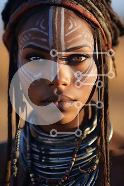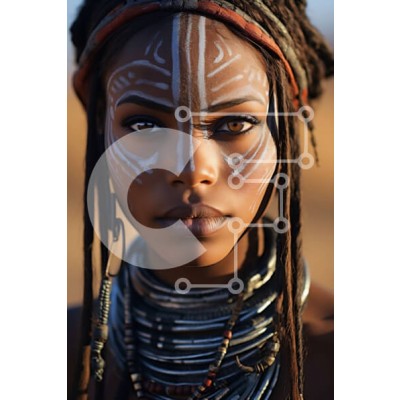 Υπάρχει δυνατότητα προσωποποίησης με δική σας φωτογραφία και προσαρμογής διαστάσεων κατόπιν παραγγελίας. Το συγεκεριμενο puzzle παρουσιαζει Αυτή η εικόνα απεικονίζει μια γυναίκα με βαμμένο πρόσωπο και στολισμένη με κεφαλή και κοσμήματα. Έχει μια σοβαρή έκφραση και κοιτάζει κατευθείαν την κάμερα. Το φόντο είναι μια σκηνή ερήμου με άμμο και βράχους. Ένα μοναδικό puzzle που συνδυάζει ποιότητα, αισθητική και εμπειρία