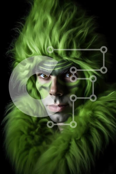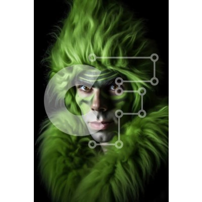 Υπάρχει δυνατότητα προσωποποίησης με δική σας φωτογραφία και προσαρμογής διαστάσεων κατόπιν παραγγελίας. Το συγεκεριμενο puzzle παρουσιαζει Αυτή η εικόνα παρουσιάζει έναν άνδρα που φορά μια πράσινη γούνινη στολή με λευκό και πράσινο μακιγιάζ στο πρόσωπό του. Φοράει επίσης ένα πράσινο καπέλο με ένα πομπόν από πάνω και ένα πράσινο φουλάρι στο λαιμό του. Ο άντρας έχει πράσινα μάτια και μακριές βλεφαρίδες και κοιτάζει