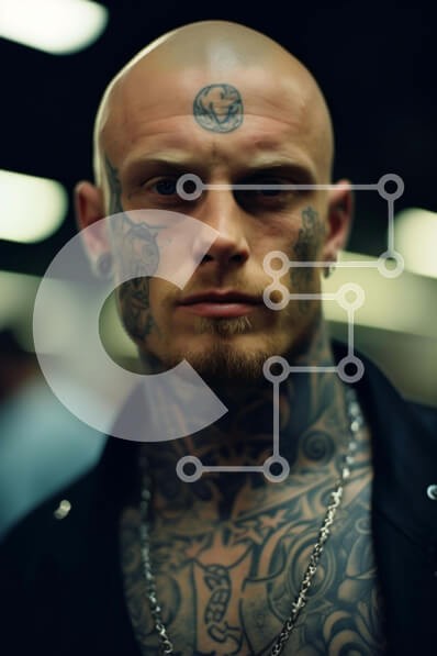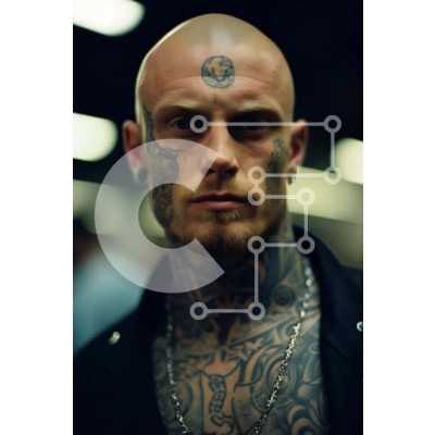 Υπάρχει δυνατότητα προσωποποίησης με δική σας φωτογραφία και προσαρμογής διαστάσεων κατόπιν παραγγελίας. Το συγεκεριμενο puzzle παρουσιαζει Η εικόνα απεικονίζει έναν φαλακρό άνδρα με εκτεταμένα τατουάζ στο πρόσωπο, το λαιμό και τους ώμους του. Στέκεται μπροστά στην κάμερα, κοιτάζει ευθεία και κοιτάζει μακριά. Υπάρχουν πολλά περιδέραια που κρέμονται γύρω από το λαιμό και τους καρπούς του, υποδηλώνοντας ότι μπορεί ν
