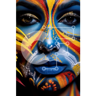 Υπάρχει δυνατότητα προσωποποίησης με δική σας φωτογραφία και προσαρμογής διαστάσεων κατόπιν παραγγελίας. Το συγεκεριμενο puzzle παρουσιαζει Αυτή η εικόνα απεικονίζει μια γυναίκα με πολύχρωμη ζωγραφική προσώπου, φορώντας μια ζωντανή κίτρινη και μπλε στολή. Στο χέρι της κρατά ένα φτερό, το οποίο προσθέτει μια επιπλέον χρωματική πινελιά στη φωτογραφία. Η έκφραση της γυναίκας είναι ουδέτερη, επιτρέποντας την εστίαση σ