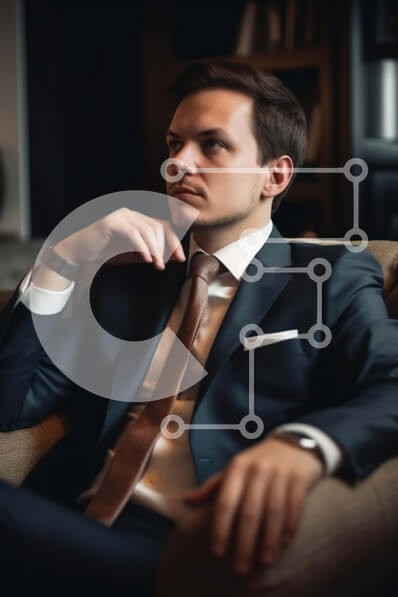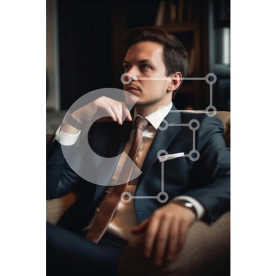 Υπάρχει δυνατότητα προσωποποίησης με δική σας φωτογραφία και προσαρμογής διαστάσεων κατόπιν παραγγελίας. Το συγεκεριμενο puzzle παρουσιαζει Αυτή η εικόνα απεικονίζει έναν σοβαρό άνδρα που φορά ένα καφέ κοστούμι, λευκό πουκάμισο και κόκκινη γραβάτα. Είναι καθισμένος σε μια καρέκλα με τα χέρια του στην αγκαλιά του και φαίνεται να έχει χαθεί στις σκέψεις του, κοιτάζοντας την απόσταση. Το σκούρο φόντο δημιουργεί ένα δ