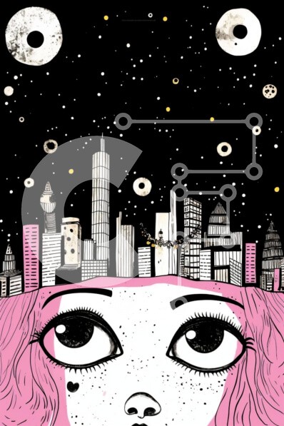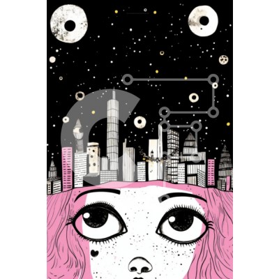 Υπάρχει δυνατότητα προσωποποίησης με δική σας φωτογραφία και προσαρμογής διαστάσεων κατόπιν παραγγελίας. Το συγεκεριμενο puzzle παρουσιαζει Αυτή η εικόνα παρουσιάζει ένα κορίτσι με ροζ μαλλιά σε ένα εντυπωσιακό αστικό τοπίο. Το κεφάλι του κοριτσιού είναι γερμένο προς τα πάνω, υποδηλώνοντας ένα βλέμμα προς τον ουρανό. Οι κύκλοι στο πρόσωπό της μπορεί να συμβολίζουν αστέρια ή πλανήτες. Ένα μοναδικό puzzle που συνδυ