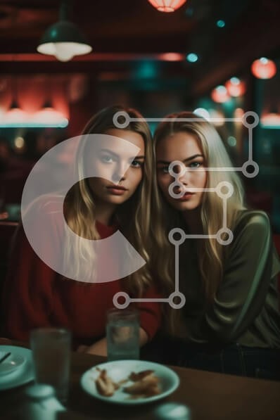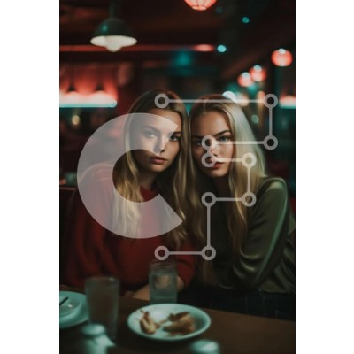 Υπάρχει δυνατότητα προσωποποίησης με δική σας φωτογραφία και προσαρμογής διαστάσεων κατόπιν παραγγελίας. Το συγεκεριμενο puzzle παρουσιαζει Αυτή η εικόνα απεικονίζει δύο νεαρές γυναίκες να κάθονται σε ένα τραπέζι σε ένα εστιατόριο με χαμηλό φωτισμό, απολαμβάνοντας η μια την παρέα της άλλης. Η μια γυναίκα έχει μακριά ξανθά μαλλιά και φοράει κόκκινο πουλόβερ, ενώ η άλλη έχει κοντά καστανά μαλλιά και φοράει πράσινο π