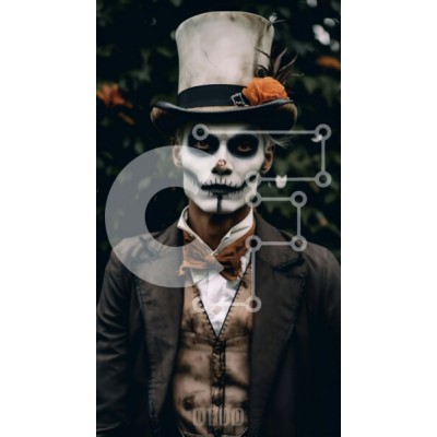 Υπάρχει δυνατότητα προσωποποίησης με δική σας φωτογραφία και προσαρμογής διαστάσεων κατόπιν παραγγελίας. Το συγεκεριμενο puzzle παρουσιαζει Αυτή η εικόνα παρουσιάζει έναν άνδρα που φορά ένα ασπρόμαυρο ριγέ πουκάμισο, μαύρο παντελόνι και μαύρα παπούτσια. Είναι ντυμένος με ένα κοστούμι σκελετό με ένα καπέλο και έχει μαύρο μουστάκι και γένια. Τα μάτια του είναι λευκά με μαύρα περιγράμματα, προσθέτοντας στο απόκοσμο α