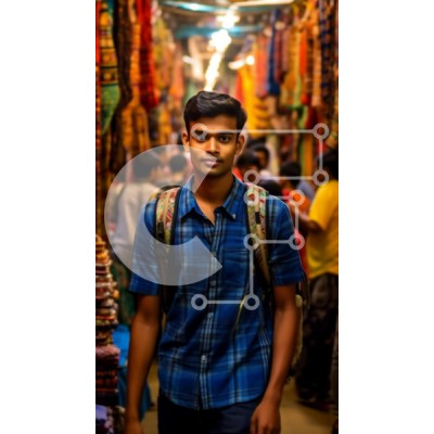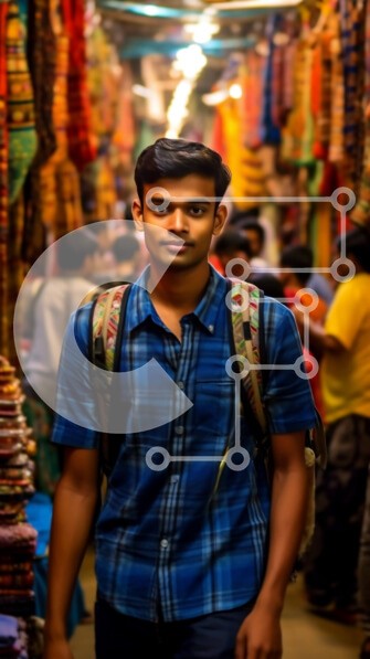 Υπάρχει δυνατότητα προσωποποίησης με δική σας φωτογραφία και προσαρμογής διαστάσεων κατόπιν παραγγελίας. Το συγεκεριμενο puzzle παρουσιαζει Αυτή η εικόνα απαθανατίζει έναν νεαρό άνδρα που στέκεται στη μέση μιας πολυσύχναστης αγοράς που περιβάλλεται από πολύχρωμα υφάσματα. Ο άνδρας φοράει ένα μπλε πουκάμισο και κρατά ένα σακίδιο, κοιτάζοντας γύρω στο πολύβουο περιβάλλον. Τα φωτεινά χρώματα των υφασμάτων δημιουργούν