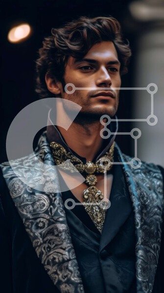 Υπάρχει δυνατότητα προσωποποίησης με δική σας φωτογραφία και προσαρμογής διαστάσεων κατόπιν παραγγελίας. Το συγεκεριμενο puzzle παρουσιαζει Αυτή η εικόνα παρουσιάζει έναν κομψό άνδρα που φορά ένα μαύρο και χρυσοκέντητο σακάκι, μαύρο παντελόνι και μαύρα παπούτσια. Έχει περιποιημένη μαύρη γενειάδα και κοιτάζει προς τη δεξιά πλευρά του κάδρου. Ένα μοναδικό puzzle που συνδυάζει ποιότητα, αισθητική και εμπειρία. Υλικ