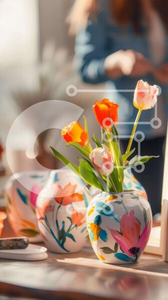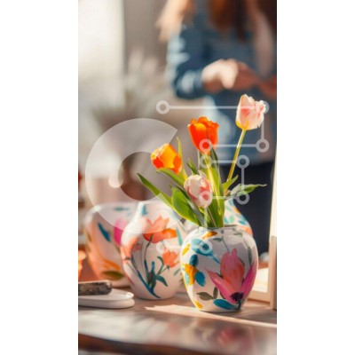 Υπάρχει δυνατότητα προσωποποίησης με δική σας φωτογραφία και προσαρμογής διαστάσεων κατόπιν παραγγελίας. Το συγεκεριμενο puzzle παρουσιαζει Η εικόνα παρουσιάζει ένα τραπέζι με πολλά πολύχρωμα βάζα γεμάτα με φρέσκα λουλούδια. Μια γυναίκα στέκεται δίπλα στο τραπέζι και κοιτάζει κάτι στο τηλέφωνο ή το tablet της. Υπάρχουν επίσης πολλά άλλα αντικείμενα στη σκηνή, όπως βιβλία, στυλό και μια ομπρέλα. Ένα μοναδικό puzzl