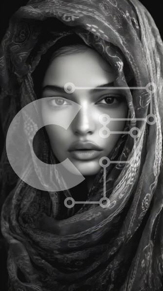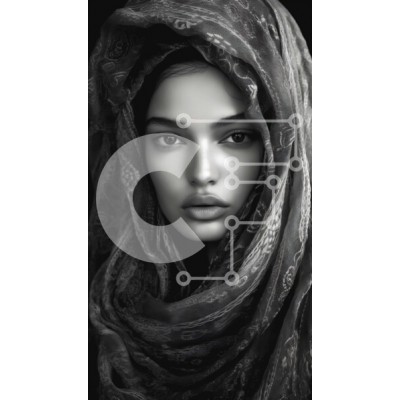 Υπάρχει δυνατότητα προσωποποίησης με δική σας φωτογραφία και προσαρμογής διαστάσεων κατόπιν παραγγελίας. Το συγεκεριμενο puzzle παρουσιαζει Αυτή η εικόνα παρουσιάζει ένα κοντινό πλάνο του προσώπου ενός ατόμου τυλιγμένο σε ένα περίπλοκο μαύρο μαντήλι ή σάλι. Το άτομο έχει εντυπωσιακά χαρακτηριστικά με έντονα φρύδια, γεμάτα χείλη και απαλή επιδερμίδα, δημιουργώντας μια σαγηνευτική έκφραση. Οι μονοχρωματικοί τόνοι εν