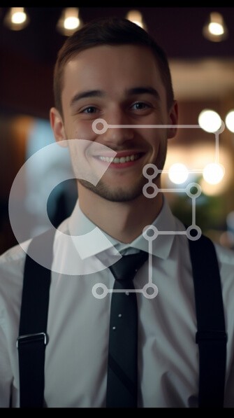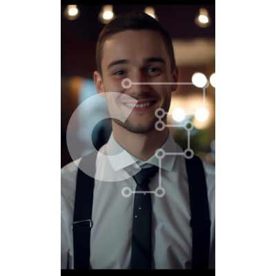 Υπάρχει δυνατότητα προσωποποίησης με δική σας φωτογραφία και προσαρμογής διαστάσεων κατόπιν παραγγελίας. Το συγεκεριμενο puzzle παρουσιαζει Αυτή η εικόνα παρουσιάζει έναν νεαρό άνδρα με ένα λαμπερό χαμόγελο, ντυμένο με επίσημη ενδυμασία που περιλαμβάνει λευκό πουκάμισο, μαύρη γραβάτα και τιράντες. Το φόντο φωτίζεται απαλά με ζεστό φωτισμό, δημιουργώντας μια φιλόξενη ατμόσφαιρα. Η έκφραση του άντρα αποπνέει ευτυχία