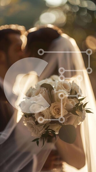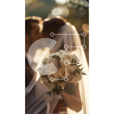 Υπάρχει δυνατότητα προσωποποίησης με δική σας φωτογραφία και προσαρμογής διαστάσεων κατόπιν παραγγελίας. Το συγεκεριμενο puzzle παρουσιαζει Η εικόνα δείχνει ένα νιόπαντρο ζευγάρι να φιλιέται, με το πέπλο της νύφης να καλύπτει το πρόσωπό τους. Στο βάθος διακρίνεται ένα μπουκέτο με λευκά τριαντάφυλλα, υποδηλώνοντας ότι ο γάμος γίνεται σε εξωτερικό χώρο. Η νύφη και ο γαμπρός φαίνεται να κρατιούνται χέρι-χέρι ή να αγκ