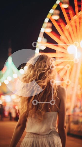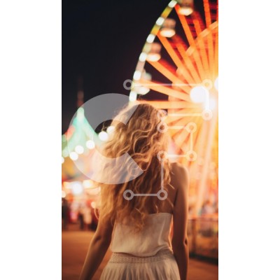 Υπάρχει δυνατότητα προσωποποίησης με δική σας φωτογραφία και προσαρμογής διαστάσεων κατόπιν παραγγελίας. Το συγεκεριμενο puzzle παρουσιαζει Η εικόνα απεικονίζει μια γυναίκα με μακριά, σγουρά μαλλιά να απομακρύνεται από μια ζωντανή σκηνή καρναβαλιού τη νύχτα, φωτισμένη από πολύχρωμα φώτα από μια ρόδα λούνα παρκ. Η ατμόσφαιρα είναι γιορτινή και ζωντανή, δημιουργώντας μια αίσθηση ενθουσιασμού και περιπέτειας. Η γυναί