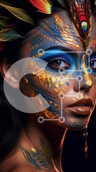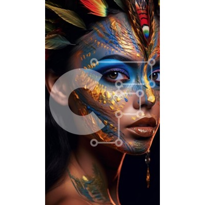 Υπάρχει δυνατότητα προσωποποίησης με δική σας φωτογραφία και προσαρμογής διαστάσεων κατόπιν παραγγελίας. Το συγεκεριμενο puzzle παρουσιαζει Αυτή η εικόνα παρουσιάζει μια γυναίκα με ζωηρή μπογιά προσώπου και φτερά στα μαλλιά της. Το πρόσωπό της είναι το κύριο επίκεντρο της εικόνας, με περίπλοκα σχέδια και έντονα χρώματα. Τα μαλλιά της είναι χτενισμένα με φτερά, προσθέτοντας στη συνολική αισθητική. Αποπνέει αυτοπεπο