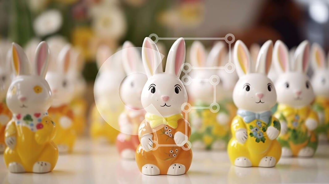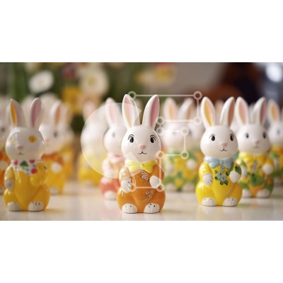 Υπάρχει δυνατότητα προσωποποίησης με δική σας φωτογραφία και προσαρμογής διαστάσεων κατόπιν παραγγελίας. Το συγεκεριμενο puzzle παρουσιαζει Αυτή η εικόνα παρουσιάζει μια ομάδα από κεραμικά ειδώλια κουνελιού σε διαφορετικά χρώματα και στυλ, τοποθετημένα πάνω σε ένα άδειο τραπέζι. Γύρω από τα κουνελάκια υπάρχουν πολλά διάσπαρτα λουλούδια, συμβάλλοντας στη συνολική αισθητική της σκηνής. Είτε ως πασχαλινό στολισμό είτ