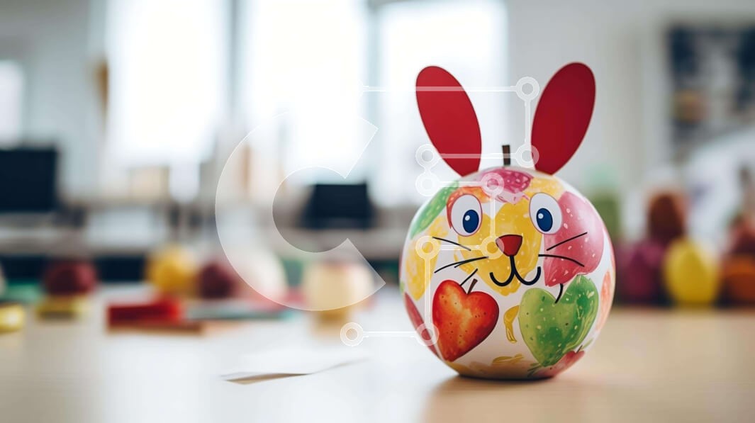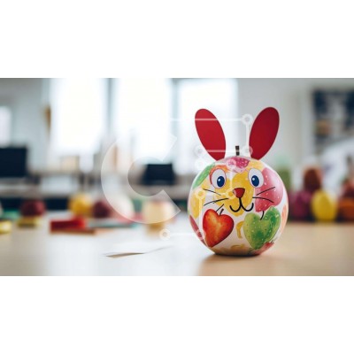 Υπάρχει δυνατότητα προσωποποίησης με δική σας φωτογραφία και προσαρμογής διαστάσεων κατόπιν παραγγελίας. Το συγεκεριμενο puzzle παρουσιαζει Αυτή η εικόνα παρουσιάζει ένα γοητευτικό αυγό κουνελιού, στολισμένο με πολύχρωμα μάτια, αυτιά και πόδια, τοποθετημένο σε ένα τραπέζι ανάμεσα σε συνδετήρες και μολύβια, υποδηλώνοντας τη χρήση του σε πασχαλινές διακοσμήσεις. Το δωμάτιο είναι διάσπαρτο με κομμάτια χαρτιού, υπονοώ