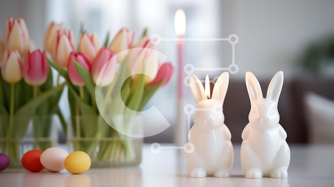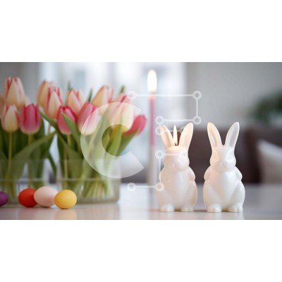 Υπάρχει δυνατότητα προσωποποίησης με δική σας φωτογραφία και προσαρμογής διαστάσεων κατόπιν παραγγελίας. Το συγεκεριμενο puzzle παρουσιαζει Αυτή η εικόνα παρουσιάζει δύο λευκά ειδώλια κουνελιών που κάθονται σε ένα τραπέζι δίπλα σε μερικές τουλίπες, πιθανότατα μέρος μιας γιορτής του Πάσχα. Ένα κερί τοποθετείται στη μέση του τραπεζιού, με διάφορα άλλα κεριά διάσπαρτα στο δωμάτιο. Πολύχρωμες διακοσμήσεις με θέμα το Π