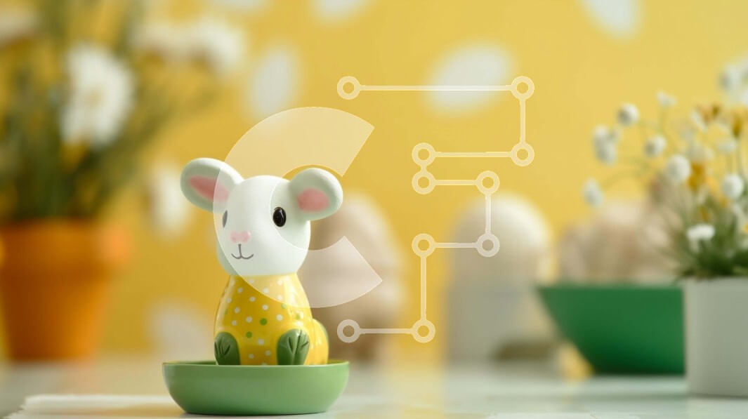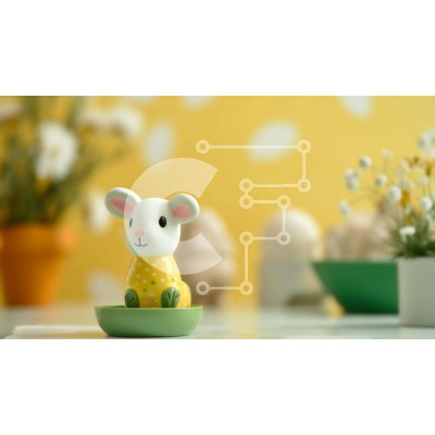 Υπάρχει δυνατότητα προσωποποίησης με δική σας φωτογραφία και προσαρμογής διαστάσεων κατόπιν παραγγελίας. Το συγεκεριμενο puzzle παρουσιαζει Αυτή η εικόνα παρουσιάζει ένα υπέροχο πασχαλινό ντεκόρ του τραπεζιού με ένα λευκό και κίτρινο ειδώλιο ποντικιού τοποθετημένο πάνω από ένα μπολ σε σχήμα αυγού. Το φόντο διαθέτει πολλά λουλούδια σε γλάστρες, δημιουργώντας ένα απολαυστικό σκηνικό για τους εορτασμούς του Πάσχα. Επ
