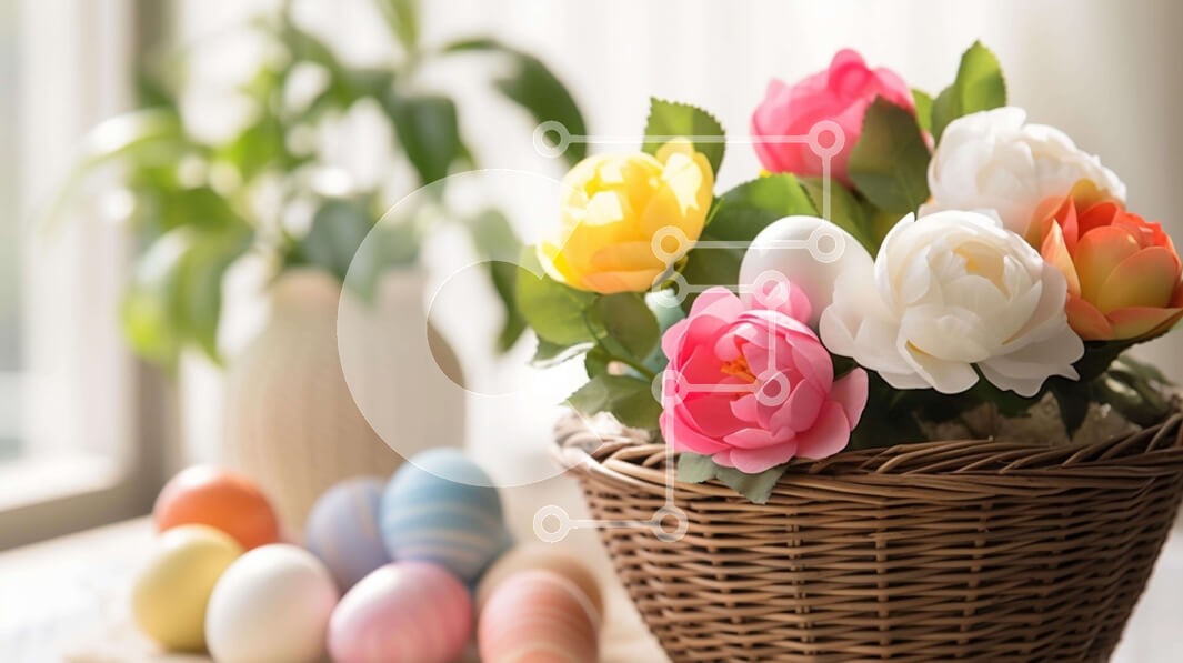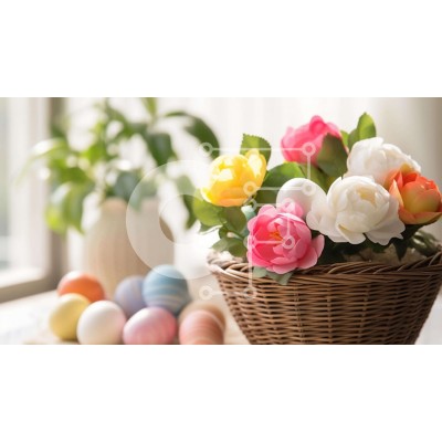 Υπάρχει δυνατότητα προσωποποίησης με δική σας φωτογραφία και προσαρμογής διαστάσεων κατόπιν παραγγελίας. Το συγεκεριμενο puzzle παρουσιαζει Αυτή η εικόνα δείχνει ένα ψάθινο καλάθι γεμάτο με πολύχρωμα λουλούδια και πασχαλινά αυγά, τοποθετημένο σε ένα τραπέζι μπροστά από ένα παράθυρο. Το σκηνικό υποδηλώνει ένα εσωτερικό περιβάλλον, με πολλά φυτά σε γλάστρες να συμβάλλουν στη σκηνή. Υπάρχει επίσης ένα φυτό ή δέντρο κ