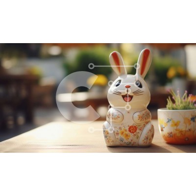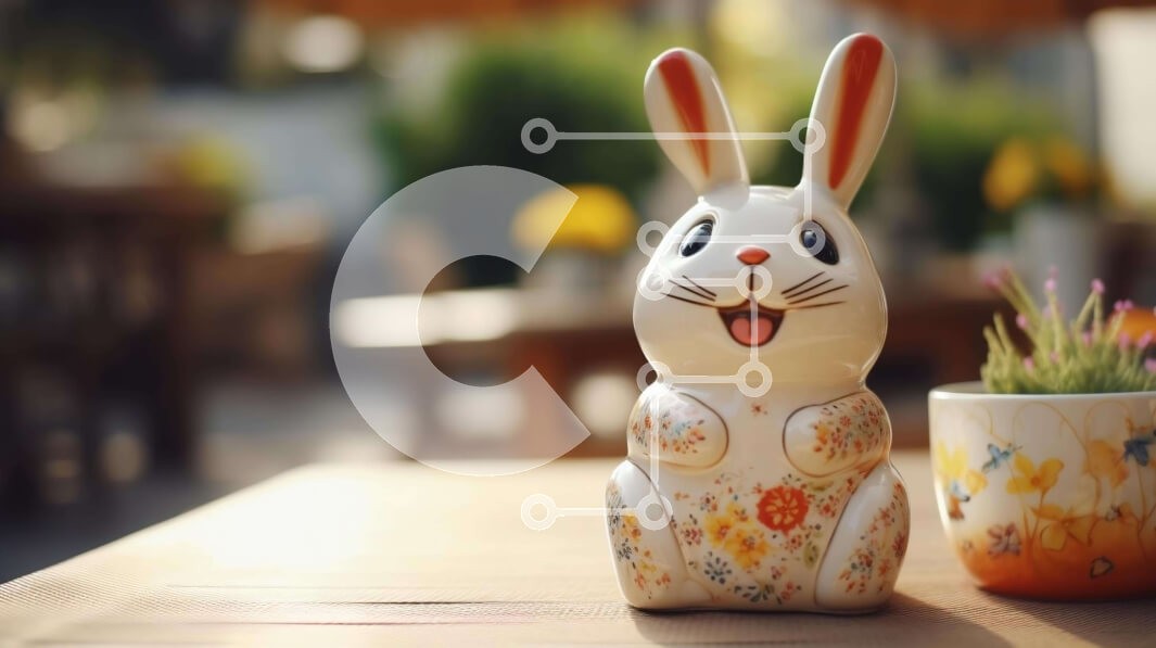 Υπάρχει δυνατότητα προσωποποίησης με δική σας φωτογραφία και προσαρμογής διαστάσεων κατόπιν παραγγελίας. Το συγεκεριμενο puzzle παρουσιαζει Η εικόνα δείχνει ένα λευκό κεραμικό ειδώλιο λαγουδάκι τοποθετημένο σε ένα τραπέζι δίπλα σε δύο φυτά σε γλάστρες. Τα φυτά φαίνονται να χαμογελούν στην εικόνα, υποδηλώνοντας πιθανώς μια γιορτή του Πάσχα. Επιπλέον, υπάρχει παρουσία ενός ανθοφόρου φυτού κοντά στο ειδώλιο του κουνε