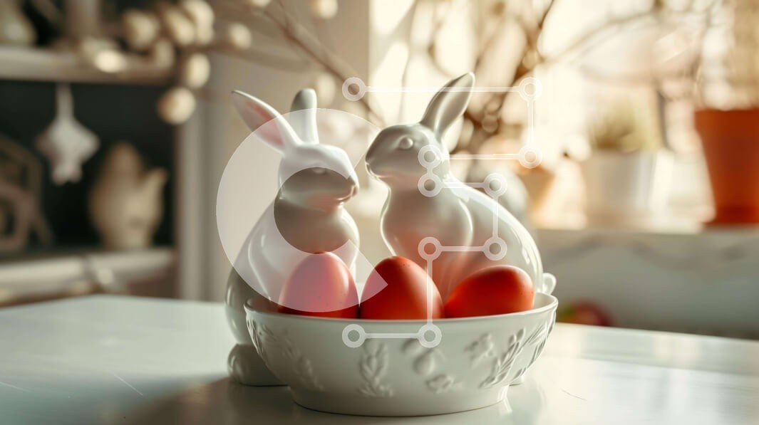 Υπάρχει δυνατότητα προσωποποίησης με δική σας φωτογραφία και προσαρμογής διαστάσεων κατόπιν παραγγελίας. Το συγεκεριμενο puzzle παρουσιαζει Η εικόνα παρουσιάζει δύο λευκά ειδώλια κουνελιών που κάθονται σε ένα μπολ γεμάτο με κόκκινα αυγά. Τα κουνελάκια φαίνεται να απολαμβάνουν το ένα τη συντροφιά του άλλου, κάτι που θα μπορούσε να είναι ένδειξη της αγάπης τους το ένα για το άλλο. Επιπλέον, υπάρχουν πολλά φυτά σε γλ