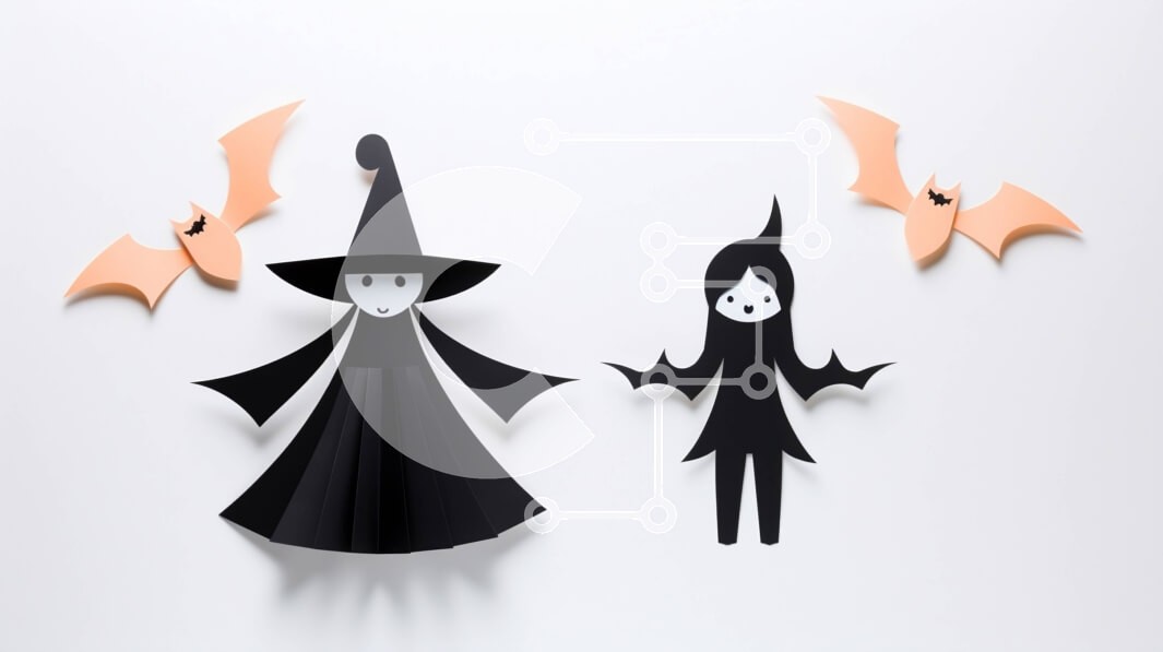Υπάρχει δυνατότητα προσωποποίησης με δική σας φωτογραφία και προσαρμογής διαστάσεων κατόπιν παραγγελίας. Το συγεκεριμενο puzzle παρουσιαζει Αυτή η εικόνα παρουσιάζει δύο χάρτινες κούκλες ντυμένες μάγισσες και νυχτερίδες σε λευκό φόντο. Οι κούκλες είναι τοποθετημένες δίπλα-δίπλα, υπονοώντας ότι μπορούν να χρησιμοποιηθούν ως μέρος μιας διακόσμησης για το Halloween. Είναι πιθανό ότι αυτές οι φιγούρες κατασκευάστηκαν