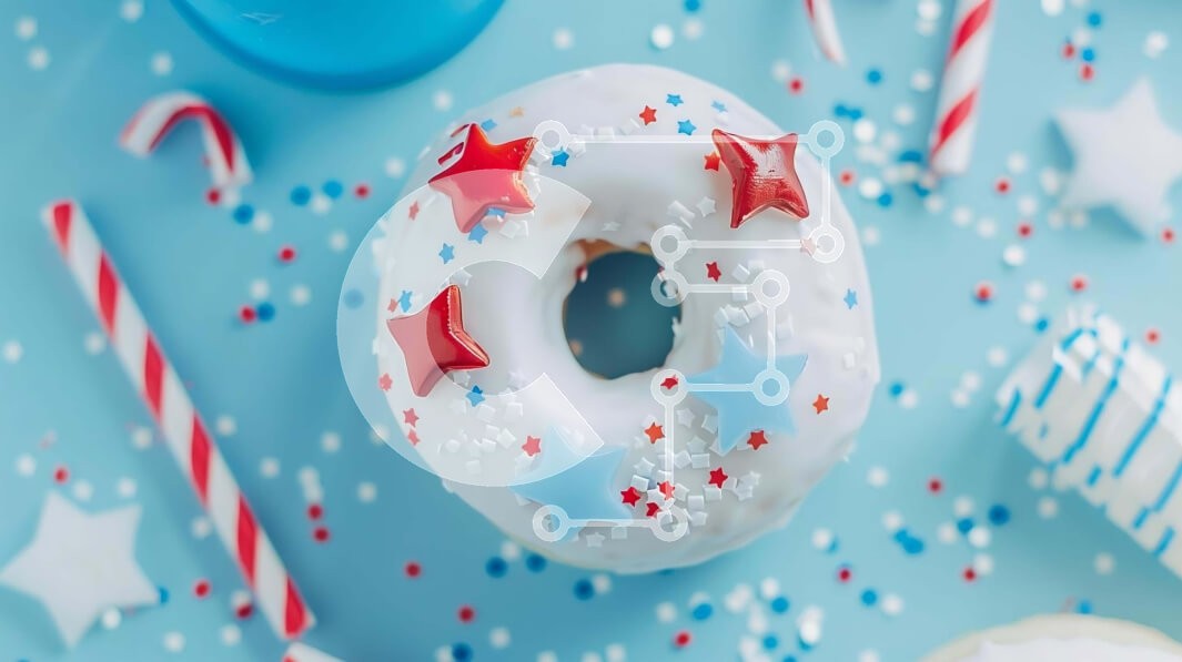 Υπάρχει δυνατότητα προσωποποίησης με δική σας φωτογραφία και προσαρμογής διαστάσεων κατόπιν παραγγελίας. Το συγεκεριμενο puzzle παρουσιαζει Η εικόνα παρουσιάζει ένα ντόνατ με πατριωτικό θέμα, στολισμένο με κόκκινα, λευκά και μπλε αστέρια, μαζί με ζαχαρωτά και άλλα εορταστικά στολίδια. Αυτά τα αντικείμενα είναι τοποθετημένα σε μπλε φόντο, υπονοώντας έναν εορτασμό για την Ημέρα της Ανεξαρτησίας. Η σκηνή περιλαμβάνει