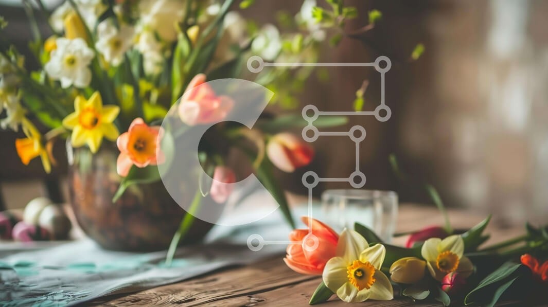 Υπάρχει δυνατότητα προσωποποίησης με δική σας φωτογραφία και προσαρμογής διαστάσεων κατόπιν παραγγελίας. Το συγεκεριμενο puzzle παρουσιαζει Αυτή η εικόνα παρουσιάζει ένα ξύλινο τραπέζι στολισμένο με νάρκισσους, τουλίπες και κρίνους, υποδηλώνοντας μια εκδήλωση ή γιορτή με θέμα το Πάσχα. Υπάρχουν επίσης αυγά και ένα ποτήρι νερό, που προσθέτουν στη γιορτινή ατμόσφαιρα. Ένα μοναδικό puzzle που συνδυάζει ποιότητα, αισ