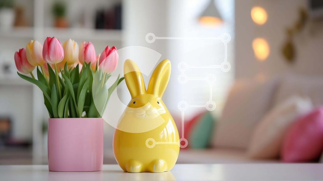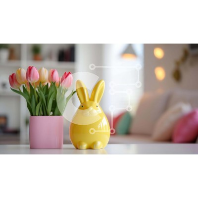 Υπάρχει δυνατότητα προσωποποίησης με δική σας φωτογραφία και προσαρμογής διαστάσεων κατόπιν παραγγελίας. Το συγεκεριμενο puzzle παρουσιαζει Η εικόνα παρουσιάζει ένα κίτρινο ειδώλιο κουνελιού τοποθετημένο σε ένα τραπέζι δίπλα σε πολλές ροζ και λευκές τουλίπες, δημιουργώντας μια υπέροχη εμφάνιση με θέμα το Πάσχα. Το δωμάτιο μπορεί να είναι στολισμένο για μια γιορτή του Πάσχα, όπως υποδεικνύεται από τα λουλούδια στο
