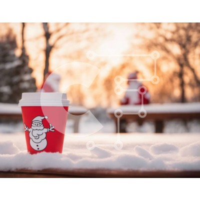 Υπάρχει δυνατότητα προσωποποίησης με δική σας φωτογραφία και προσαρμογής διαστάσεων κατόπιν παραγγελίας. Το συγεκεριμενο puzzle παρουσιαζει Αυτή η εικόνα απεικονίζει ένα κόκκινο φλιτζάνι καφέ τοποθετημένο στην κορυφή ενός χιονισμένου εδάφους, που περιβάλλεται από ένα υπαίθριο τραπέζι και καρέκλες. Στο βάθος διακρίνονται δύο ειδώλια του Άγιου Βασίλη, δίνοντας μια εορταστική πινελιά στη σκηνή. Αρκετοί πάγκοι είναι ε