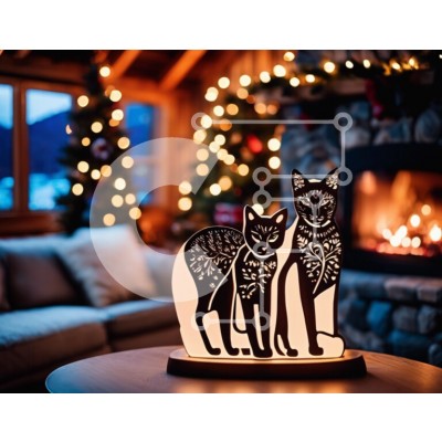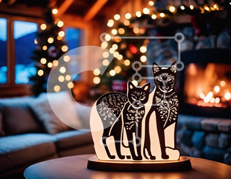 Υπάρχει δυνατότητα προσωποποίησης με δική σας φωτογραφία και προσαρμογής διαστάσεων κατόπιν παραγγελίας. Το συγεκεριμενο puzzle παρουσιαζει Αυτή η εικόνα παρουσιάζει ένα επιτραπέζιο φωτιστικό με δύο σιλουέτες γατών που κάθονται πάνω του. Τοποθετείται μπροστά σε τζάκι, προσθέτοντας ζεστασιά και θαλπωρή στο χώρο. Γύρω από το τραπέζι υπάρχουν διάφορα χριστουγεννιάτικα στολίδια, όπως δέντρα, στεφάνια και γιρλάντες. Έ