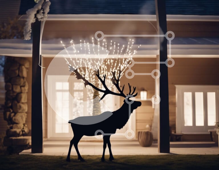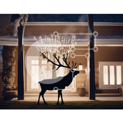 Υπάρχει δυνατότητα προσωποποίησης με δική σας φωτογραφία και προσαρμογής διαστάσεων κατόπιν παραγγελίας. Το συγεκεριμενο puzzle παρουσιαζει Αυτή η εικόνα παρουσιάζει ένα άγαλμα ελαφιού διακοσμημένο για τις γιορτές. Είναι ένα κοντινό πλάνο που δείχνει τα ελάφια να στέκονται μπροστά από ένα σπίτι στολισμένο με φώτα και διακοσμητικά. Τα φώτα που περιβάλλουν το άγαλμα δημιουργούν μια εορταστική ατμόσφαιρα, ιδανική για
