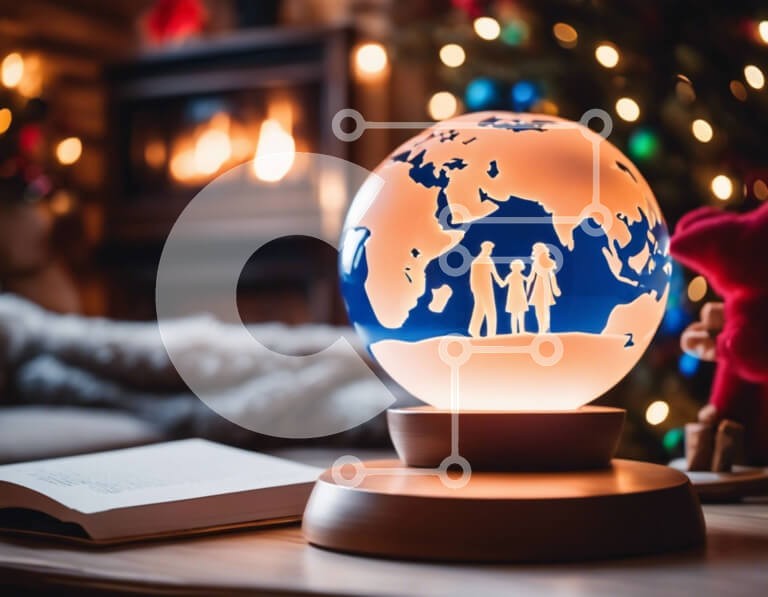 Υπάρχει δυνατότητα προσωποποίησης με δική σας φωτογραφία και προσαρμογής διαστάσεων κατόπιν παραγγελίας. Το συγεκεριμενο puzzle παρουσιαζει Αυτή η εικόνα δείχνει μια σφαίρα διακοπών με σιλουέτες μελών της οικογένειας, τοποθετημένες πάνω από ένα ανοιχτό βιβλίο. Η σκηνή είναι διακοσμημένη με χριστουγεννιάτικα φωτάκια, ειδώλια ταράνδων και αρκουδάκια, δημιουργώντας μια εορταστική ατμόσφαιρα. Είναι μια ιδανική διακόσμ