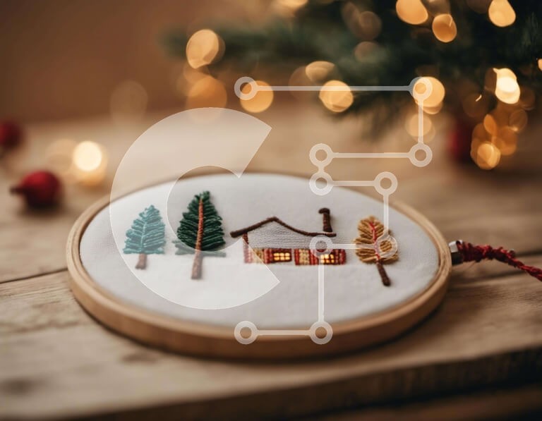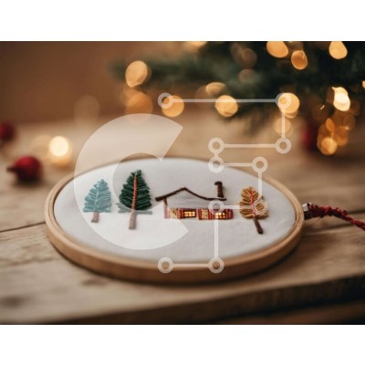 Υπάρχει δυνατότητα προσωποποίησης με δική σας φωτογραφία και προσαρμογής διαστάσεων κατόπιν παραγγελίας. Το συγεκεριμενο puzzle παρουσιαζει Αυτή η εικόνα παρουσιάζει ένα τσέρκι κεντήματος με ένα όμορφα δημιουργημένο σχέδιο ενός σπιτιού, δέντρων και νιφάδων χιονιού. Τοποθετείται σε ένα ξύλινο τραπέζι που περιβάλλεται από χριστουγεννιάτικα λαμπάκια και στολίδια, δημιουργώντας μια γιορτινή ατμόσφαιρα. Χρησιμοποιήστε