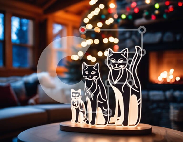 Υπάρχει δυνατότητα προσωποποίησης με δική σας φωτογραφία και προσαρμογής διαστάσεων κατόπιν παραγγελίας. Το συγεκεριμενο puzzle παρουσιαζει Αυτή η εικόνα παρουσιάζει ένα άνετο σαλόνι με τρεις σιλουέτες γάτες που κάθονται σε ένα τραπέζι. Το τζάκι στο βάθος προσθέτει στη ζεστή και φιλόξενη ατμόσφαιρα του δωματίου. Διάφορα στολίδια, μεταξύ των οποίων χριστουγεννιάτικα φωτάκια και ένα διακοσμητικό χριστουγεννιάτικο δέ