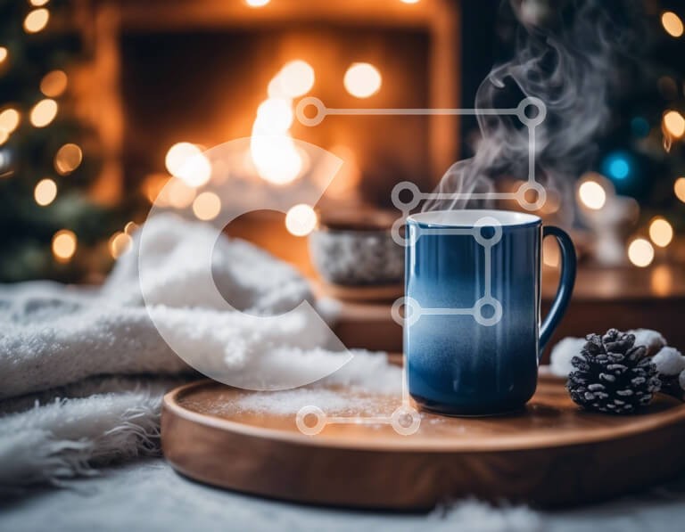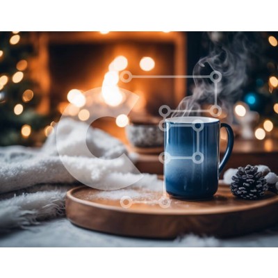 Υπάρχει δυνατότητα προσωποποίησης με δική σας φωτογραφία και προσαρμογής διαστάσεων κατόπιν παραγγελίας. Το συγεκεριμενο puzzle παρουσιαζει Αυτή η εικόνα δείχνει μια μπλε κούπα καφέ με ατμό να βγαίνει από αυτήν, τοποθετημένη πάνω από έναν διακοσμητικό ξύλινο δίσκο μπροστά από ένα τζάκι. Η σκηνή υποδηλώνει μια ζεστή χειμωνιάτικη στιγμή, με κουκουνάρια και νιφάδες χιονιού διάσπαρτα γύρω από το τραπέζι, δημιουργώντας
