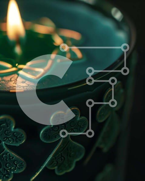 Υπάρχει δυνατότητα προσωποποίησης με δική σας φωτογραφία και προσαρμογής διαστάσεων κατόπιν παραγγελίας. Το συγεκεριμενο puzzle παρουσιαζει Αυτή η εικόνα δείχνει ένα πράσινο κερί στολισμένο με φύλλα τριφυλλιού, υποδηλώνοντας ένα θέμα για την Ημέρα του Αγίου Πατρικίου. Το αναμμένο κερί τοποθετείται κοντά στην επιφάνεια του τραπεζιού, προσθέτοντας ένα διακοσμητικό στοιχείο στο σκηνικό. Πολλαπλά κεριά, μερικά από τα
