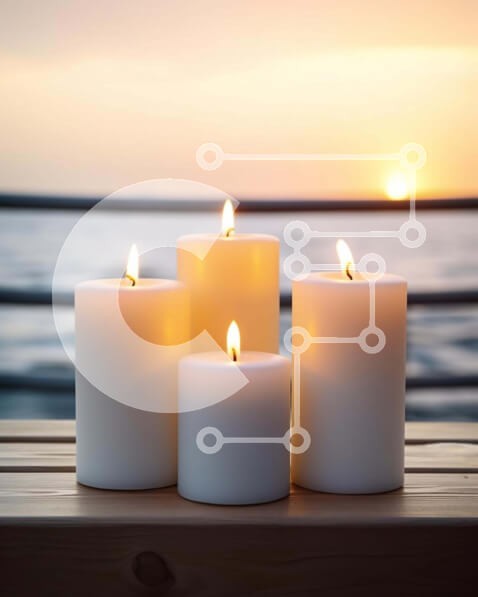 Υπάρχει δυνατότητα προσωποποίησης με δική σας φωτογραφία και προσαρμογής διαστάσεων κατόπιν παραγγελίας. Το συγεκεριμενο puzzle παρουσιαζει Η εικόνα παρουσιάζει τέσσερα λευκά κεριά που φωτίζονται στο ηλιοβασίλεμα σε ένα ξύλινο τραπέζι με τον ωκεανό στο φόντο. Τα κεριά είναι στρατηγικά τοποθετημένα για να προσφέρουν διάφορες γωνίες θέασης και προοπτικές. Ένα μοναδικό puzzle που συνδυάζει ποιότητα, αισθητική και εμ