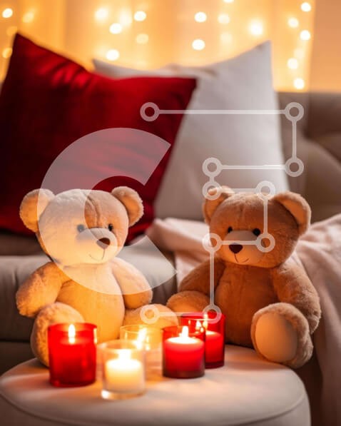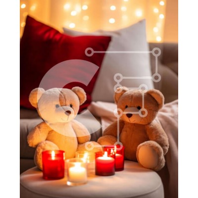 Υπάρχει δυνατότητα προσωποποίησης με δική σας φωτογραφία και προσαρμογής διαστάσεων κατόπιν παραγγελίας. Το συγεκεριμενο puzzle παρουσιαζει Αυτή η εικόνα παρουσιάζει δύο αρκουδάκια που κάθονται σε ένα σκαμπό δίπλα σε δύο κόκκινα κεριά, δημιουργώντας μια ζεστή και ρομαντική ατμόσφαιρα. Το δωμάτιο είναι διακοσμημένο για την Ημέρα του Αγίου Βαλεντίνου, με διάσπαρτα μαξιλάρια και κουβέρτες που προσθέτουν στη ζεστασιά