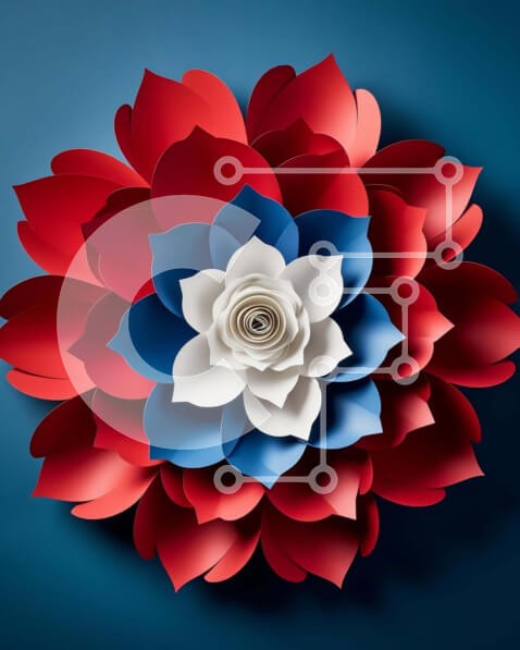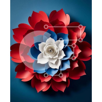 Υπάρχει δυνατότητα προσωποποίησης με δική σας φωτογραφία και προσαρμογής διαστάσεων κατόπιν παραγγελίας. Το συγεκεριμενο puzzle παρουσιαζει Η εικόνα δείχνει ένα κόκκινο, λευκό και μπλε χάρτινο λουλούδι διατεταγμένο σε σχήμα αμερικανικής σημαίας. Είναι ένα σύμβολο που αντιπροσωπεύει τις σημαίες των Ηνωμένων Πολιτειών ή άλλων χωρών, κατάλληλο για διακοσμητικούς σκοπούς όπως κεντρικά στολίδια γάμου ή διακοσμητικά τρα