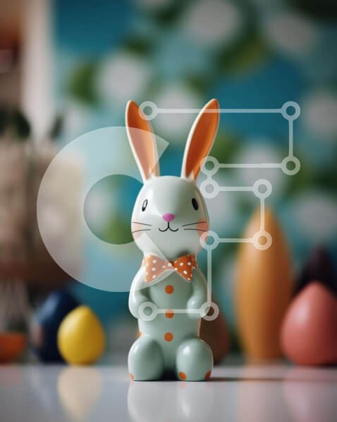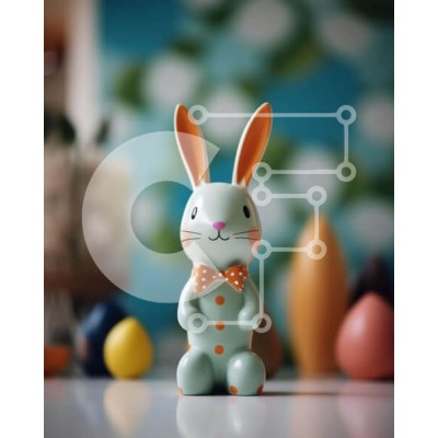 Υπάρχει δυνατότητα προσωποποίησης με δική σας φωτογραφία και προσαρμογής διαστάσεων κατόπιν παραγγελίας. Το συγεκεριμενο puzzle παρουσιαζει Αυτή η εικόνα παρουσιάζει ένα λαγουδάκι με οκταγωνικό παπιγιόν, τοποθετημένο μπροστά από πολλά στολισμένα πασχαλινά αυγά. Το ειδώλιο και τα αυγά είναι διακοσμημένα με παστέλ χρώματα και πουά τόνους, δημιουργώντας ένα εορταστικό και χαρούμενο σκηνικό. Άλλα αντικείμενα, όπως πιά