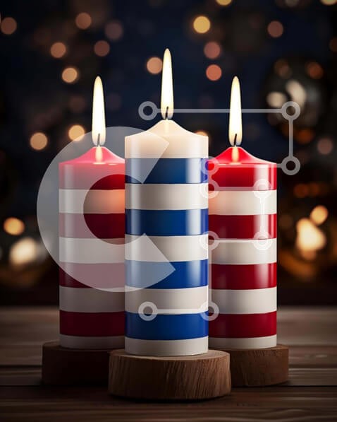 Υπάρχει δυνατότητα προσωποποίησης με δική σας φωτογραφία και προσαρμογής διαστάσεων κατόπιν παραγγελίας. Το συγεκεριμενο puzzle παρουσιαζει Η εικόνα παρουσιάζει τρία κόκκινα, λευκά και μπλε ριγέ κεριά σε ένα ξύλινο τραπέζι. Τοποθετούνται στη μέση του τραπεζιού ώστε να φαίνονται από όλες τις πλευρές. Υπάρχουν πολλά φώτα που περιβάλλουν τα κεριά, γεγονός που προσθέτει στην εορταστική ατμόσφαιρα αυτής της σκηνής. Έν