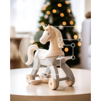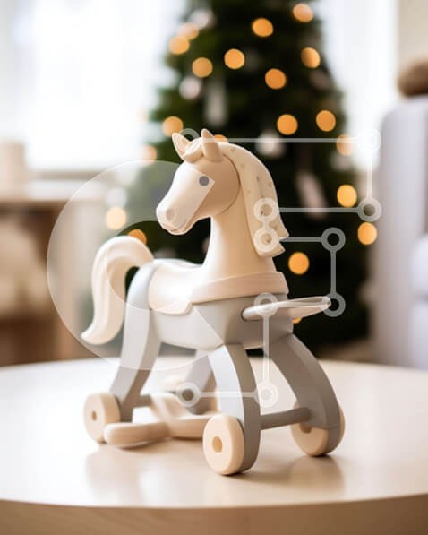 Υπάρχει δυνατότητα προσωποποίησης με δική σας φωτογραφία και προσαρμογής διαστάσεων κατόπιν παραγγελίας. Το συγεκεριμενο puzzle παρουσιαζει Αυτή η εικόνα δείχνει ένα ξύλινο άλογο παιχνίδι τοποθετημένο σε ένα τραπέζι μπροστά από ένα διακοσμητικό χριστουγεννιάτικο δέντρο. Το άλογο είναι κατασκευασμένο από ξύλο και βαμμένο με λευκό χρώμα, υποδηλώνοντας ότι προορίζεται για παιδιά. Το δωμάτιο είναι επιπλωμένο με καρέκλ