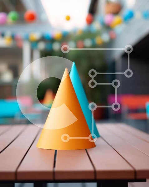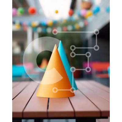 Υπάρχει δυνατότητα προσωποποίησης με δική σας φωτογραφία και προσαρμογής διαστάσεων κατόπιν παραγγελίας. Το συγεκεριμενο puzzle παρουσιαζει Η εικόνα απεικονίζει ένα ξύλινο τραπέζι με δύο πολύχρωμους κώνους που στηρίζονται πάνω του, που περιβάλλεται από γιορτινά μπαλόνια που κρέμονται από την οροφή στο βάθος. Το εξωτερικό σκηνικό με διάσπαρτες καρέκλες και τραπέζια συνεπάγεται μια ζωντανή γευστική εμπειρία. Ένα μο
