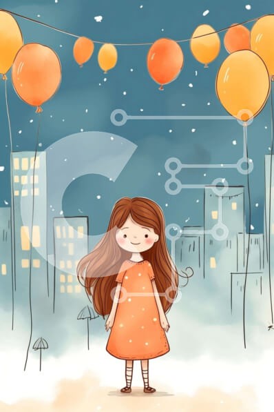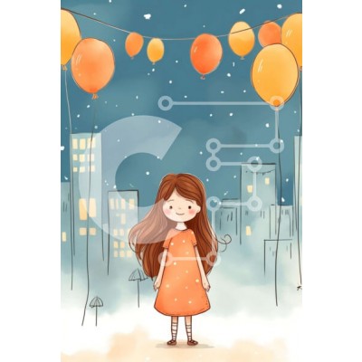 Υπάρχει δυνατότητα προσωποποίησης με δική σας φωτογραφία και προσαρμογής διαστάσεων κατόπιν παραγγελίας. Το συγεκεριμενο puzzle παρουσιαζει Η εικόνα παρουσιάζει ένα κορίτσι κινουμένων σχεδίων με πορτοκαλί φόρεμα που στέκεται στη χιονισμένη πόλη. Υπάρχουν πολλά πορτοκαλί μπαλόνια που κρέμονται από τον ουρανό, υποδηλώνοντας ότι η κοπέλα διασκεδάζει και γιορτάζει με τις φίλες της. Επιπλέον, υπάρχουν πολλές ομπρέλες δ