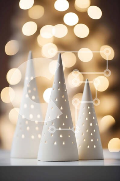 Υπάρχει δυνατότητα προσωποποίησης με δική σας φωτογραφία και προσαρμογής διαστάσεων κατόπιν παραγγελίας. Το συγεκεριμενο puzzle παρουσιαζει Αυτή η εικόνα παρουσιάζει τρία λευκά κεραμικά δέντρα διακοπών τοποθετημένα σε ένα τραπέζι. Είναι όμορφα διακοσμημένα και μπορούν να χρησιμοποιηθούν ως διακοσμητικά αντικείμενα ή στολίδια. Το φόντο φωτίζεται, προσθέτοντας μια μαγική πινελιά στη σκηνή. Ένα μοναδικό puzzle που σ