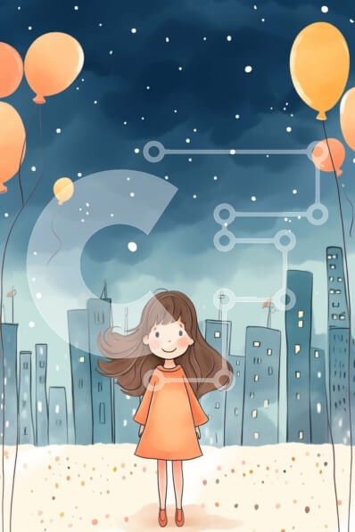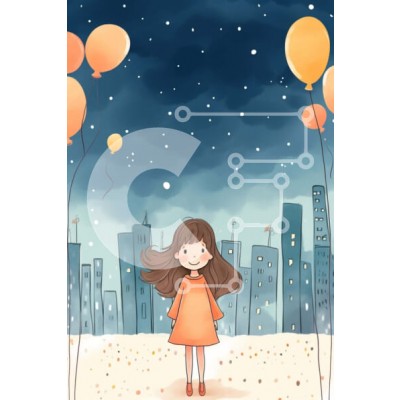 Υπάρχει δυνατότητα προσωποποίησης με δική σας φωτογραφία και προσαρμογής διαστάσεων κατόπιν παραγγελίας. Το συγεκεριμενο puzzle παρουσιαζει Η εικόνα απεικονίζει ένα κορίτσι με ένα πορτοκαλί φόρεμα να στέκεται στη χιονισμένη πόλη, με μπαλόνια να πετούν γύρω της. Το κορίτσι κρατά ψηλά δύο πορτοκαλί μπάλες, που μπορεί να αντιπροσωπεύουν την ευτυχία ή τη χαρά. Υπάρχουν επίσης πολλά κτίρια και δέντρα που περιβάλλουν το