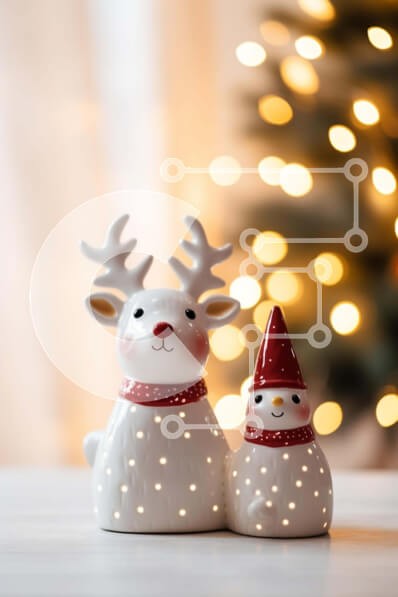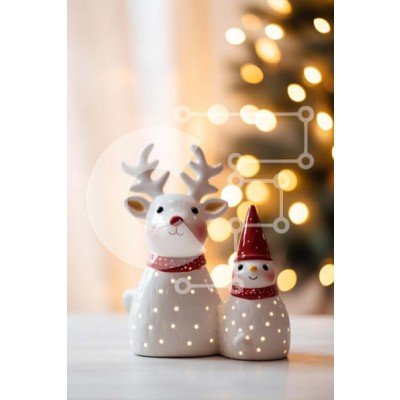 Υπάρχει δυνατότητα προσωποποίησης με δική σας φωτογραφία και προσαρμογής διαστάσεων κατόπιν παραγγελίας. Το συγεκεριμενο puzzle παρουσιαζει Αυτή η εικόνα παρουσιάζει δύο ειδώλια ταράνδων και έναν χιονάνθρωπο που κάθονται το ένα δίπλα στο άλλο σε ένα τραπέζι. Πιθανότατα τοποθετούνται εκεί για λόγους επίδειξης ή διακόσμησης. Το φόντο φωτίζεται με πολλά φώτα, δημιουργώντας μια γιορτινή και μαγική ατμόσφαιρα. Ένα μον